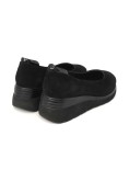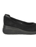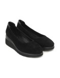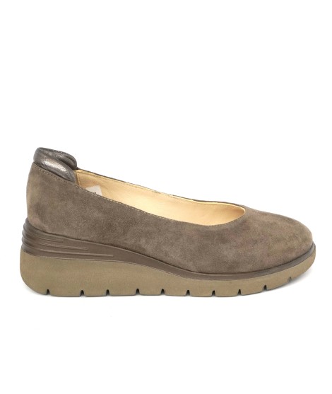 La tomaia in pelle scamosciata poggia su un tacco a zeppa leggero e flessibile.