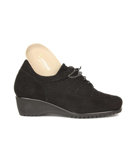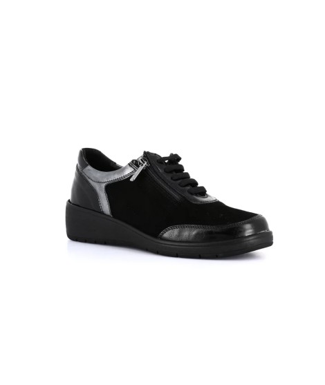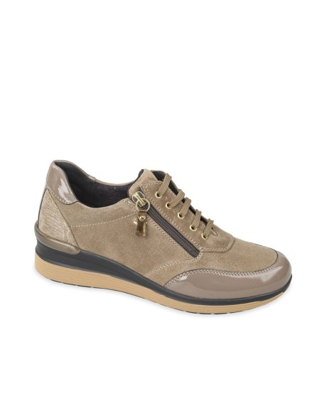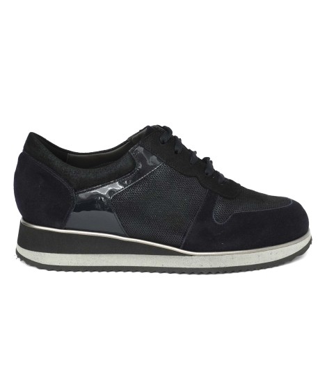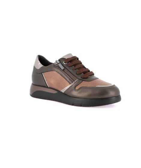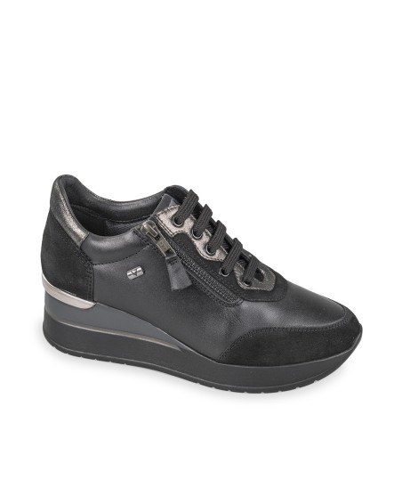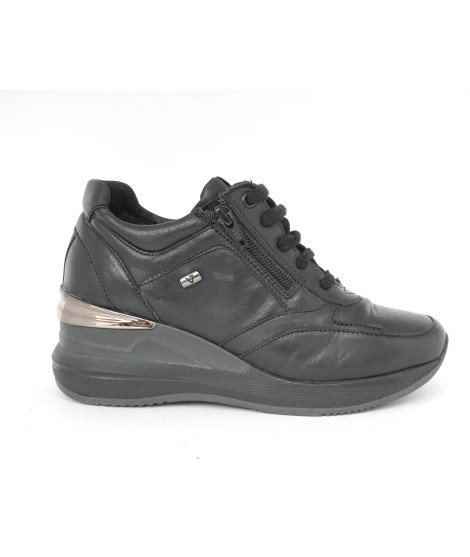Sneakers Valleverde VD252W con zeppa interna, dal design sportivo ma raffinato, realizzate con tomaia in pelle, effetto scamosciato e tessuto tecnico che creano eleganti contrasti di luce e texture. I dettagli in naplak aggiungono un tocco moderno e ricercato, mentre la chiusura con lacci è completata da una pratica zip laterale che rende la calzata semplice e veloce. La suola in gomma, leggera e ammortizzata, assicura comfort e sostegno per tutta la giornata, mentre la zeppa interna slancia la silhouette senza rinunciare alla comodità.