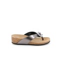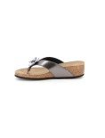 Tutta la leggerezza del sughero racchiusa in una delicata zeppa pensata per slanciare. Il sottopiede in sughero naturale ammortizza l’impatto al suolo e risulta morbidissimo anche dopo molte ore di calzata. Un occhio di riguardo allo stile: tomaia metallizzata con applicazione strass.
