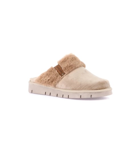 Ciabatta in morbido scamosciato con fascia teddy sul collo del piede, arricchita da un ricamo .