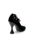 Décolleté in camoscio nero con accessorio floreale in vernice nera e velluto bordeaux e borchie.