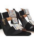 Tomaia in Camoscio con Scacchi rivestiti di Strass Multicolore e vinile trasparente con cinturino regolabile .