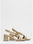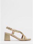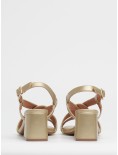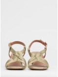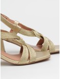 Sandalo con tacco firmato Bibi Lou realizzato in pelle e tessuto intrecciato color oro.
