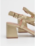 Il tacco a blocchetto rivestito in oro è alto 7 cm.
