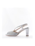 Scarpa in ecopelle e tessuto con glitter, sottopiede in vera pelle e tacco largo alto.