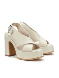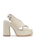 Osate catturare gli sguardi con i sandali in pelle off white realizzati da Cult per questa stagione. Si ergono su un imponente tacco a blocco personalizzato con il logo lettering laterale, presentano un generoso plateau e chisura con fibbia metallica.
