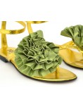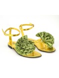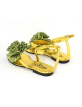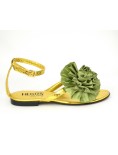 I sandali HEGO'S Milano  sono un elemento elegante del tuo guardaroba estivo. La tomaia dorata è decorata con un grande fiore in raso di colore nero. I sandali si allacciano intorno alla caviglia con un cinturino con fibbia regolabile.
