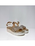 Eleganti sandali Pasquini modello 2876 in pelle laminta color platino con platform, con fascia con dettagli impreziosita da scintillanti strass, comode e facili da regolare grazie al suo cinturino sul tallone con fibbia.