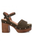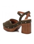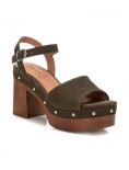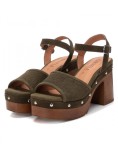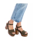 Sandalo da donna, della marca Carmela. Realizzata in crosta di pelle dal disegno geometrico. Chiusura con cinturino alla caviglia con fibbia. Tacco 10cm con plateau anteriore in finitura legno. Particolare delle borchie sul pavimento. Suola antiscivolo.