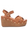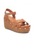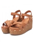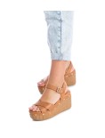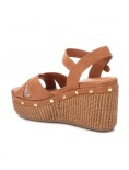 Sandalo da donna, della marca Carmela. Realizzato in pelle di alta qualità. Tomaia incrociata e cinturino alla caviglia con fibbia in metallo. Borchie decorative laterali. Zeppa 9 cm con plateau foderato in rafia in tinta con il modello. Suola in gomma antiscivolo.