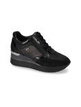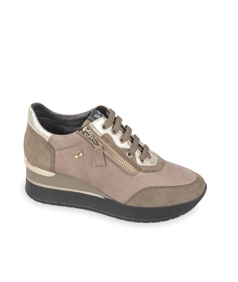 Sneakers Valleverde 36426l con zeppa interna, dal design sportivo ma raffinato, realizzate con tomaia in pelle abbinata a inserti in vernice, effetto scamosciato e tessuto tecnico che creano eleganti contrasti di luce e texture. I dettagli in vernice e gli inserti metallici sul tallone aggiungono un tocco moderno e ricercato, mentre la chiusura con lacci è completata da una pratica zip laterale che rende la calzata semplice e veloce. La suola in gomma, leggera e ammortizzata, assicura comfort e sostegno per tutta la giornata, mentre la zeppa interna slancia la silhouette senza rinunciare alla comodità.
