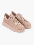 In morbida pelle scamosciata e idrorepellente, logo stampato, 3 charms Gioiello in metallo, spoiler in pelle metal , colletto in laminato .
