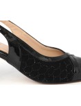 Tomaia in Camoscio con applicazione di strass e profili in vernice, puntale in nappa laminata.
