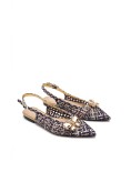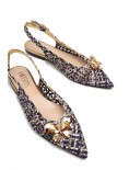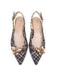 Ballerine realizzate in treccia di raso, in un insolito accostamento di oro e blu navy.