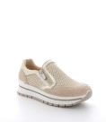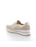 Sneakers slipon con tomaia traforata in pelle laminata oro e riporti in camoscio beige.