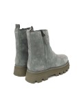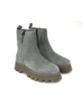 Tronchetto in camoscio grigio, dotato di una soffice fodera calda. Con zip interna regolabile ed esterna decorativa.